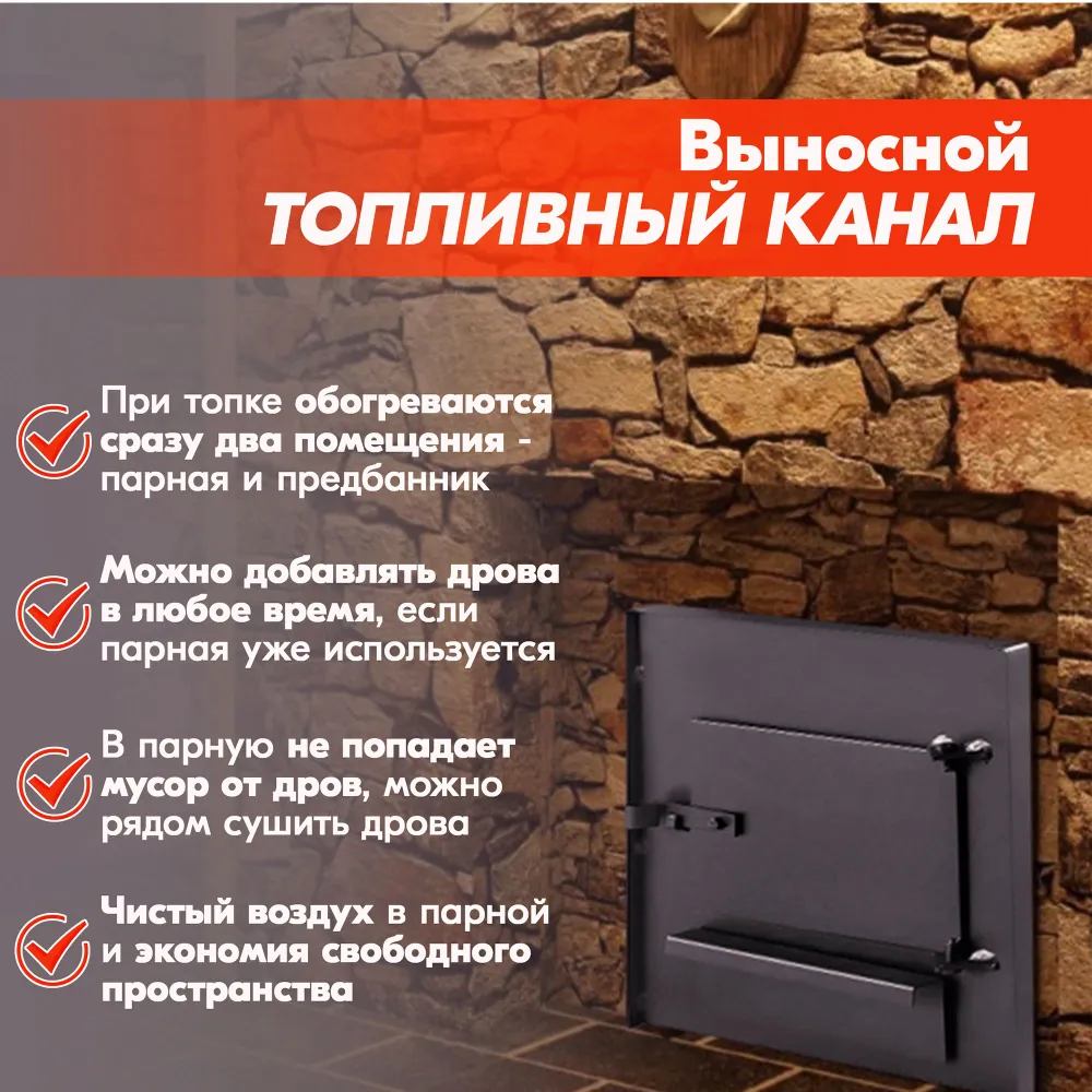Между топкой и кожухом имеется зазор, в котором образуется конвекционный поток, способствующий циркуляции воздуха в парной, а также дополнительному теплу для нагрева камней.